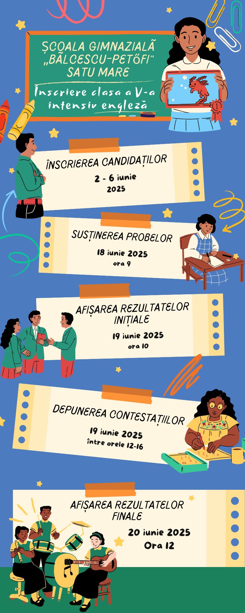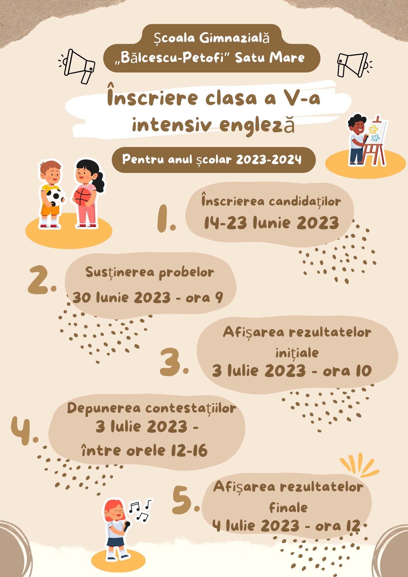 Școala Gimnazială „Bălcescu-Petofi” Satu Mare, face înscrieri în clasa a V-a, limba engleză intensiv, în perioada 2 iunie – 6 iunie 2025 la secretariatul unității, între orele